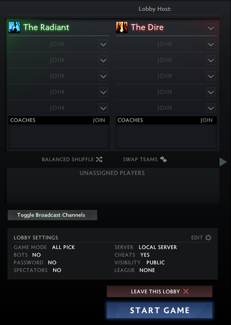 Dire, or a broadcaster slot. A team identity may be applied to either team, and bots of any difficulty may be added to player slots. Teams may be swapped or automatically balanced.
